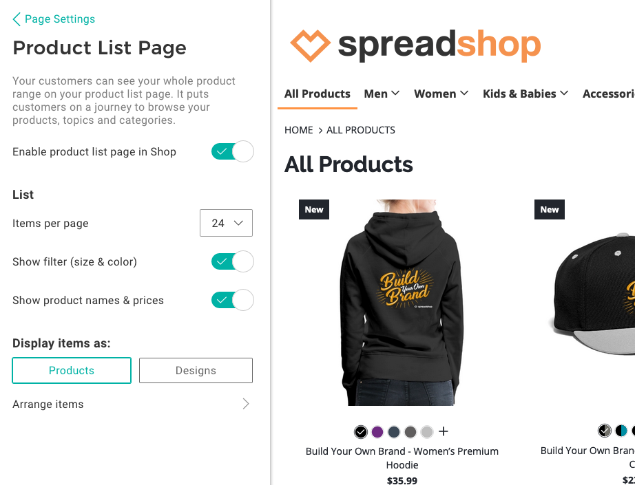Please go to Arrange Items and choose how you would like to have your products displayed. Please know that if you have more than 10 designs we recommend you choose the design view for your customers. That way they first land on all designs and then see all products “behind” every design.