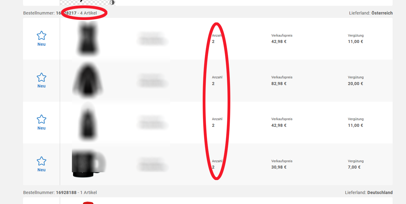 Die Anzeige wird noch harmonisiert. Zur Zeit wird in der Partner Area die Anzahl an Produkten gezeigt (also bei der Bestellung wurden 4 Produkte jeweils zweimal gekauft) anstatt die Gesamtmenge and items (wie in der App). Partner Area wird dann in den nächsten Tagen das selbe anzeigen wie die App