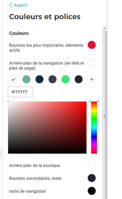 Hello, je ne trouve pas d’option afin de choisir les couleurs de ma boutique … fond, texte, bouton, etc …