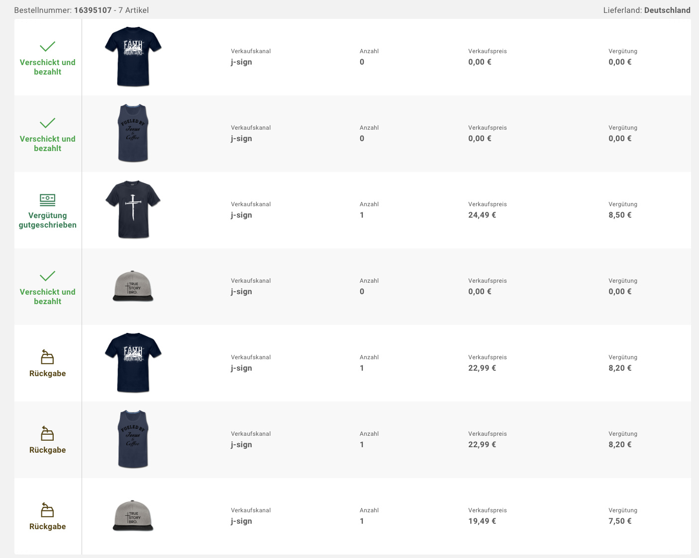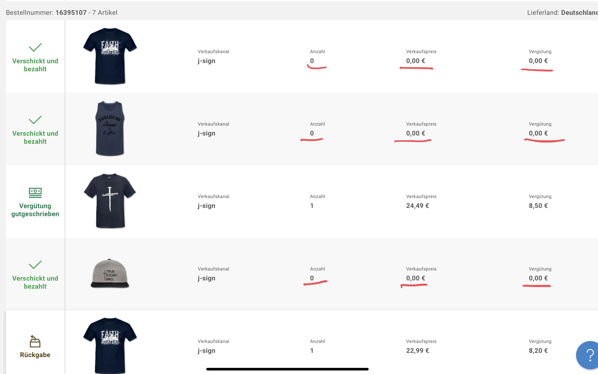 Hallo @Lena_Spreadshop ich hab wieder was seltsames in der statistik entdeckt. Kannst du mir das erklären? Wieso sind 2 sachen bestellt, eine davon ging zurück und die andere wird mit 0€ gutgeschrieben?