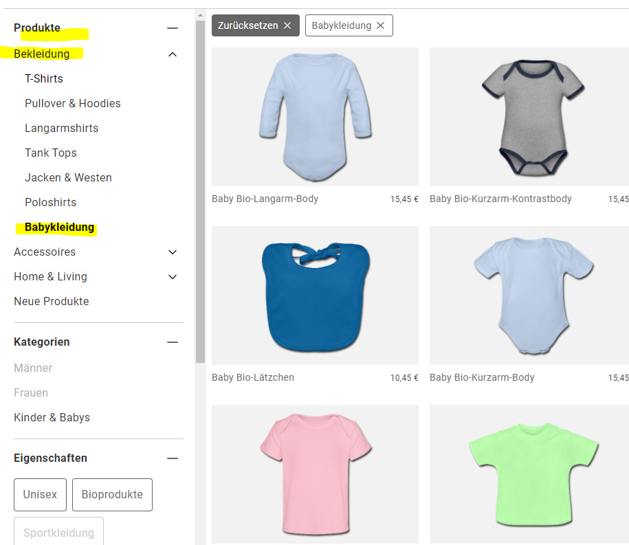 Wenn man Babykleidung sucht, muss man zuerst auf “Kinder & Bays” klicken, dann runterscrollen zu den Größen und dort “Babys” auswählen. Dann hat man allerdings das Problem, dass zB keine Lätzchen angezeigt werden. Und auch die T-Shirts mit Raffung fehlen, die gibt es ja schon ab 2 Jahren - oder sind das dann Kinder und keine Babies mehr? Die Größen XS bis XXL bei den Kindern sind auch seltsam, die treffen auf 1-3 Produtke zu.