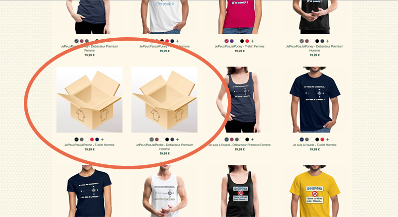 J’ai récemment reçu un email concernant un t-shirt refusé, car il était écrit “Je peux pas j’ai pêche”, et apparemment cette phrase est déposée. Le design n’est donc plus dans ma liste de design, en effet (Même dans la liste des design refusés), mais il est toujours présent sur ma boutique avec une image qui ne fait pas vraiment très pro du coup…