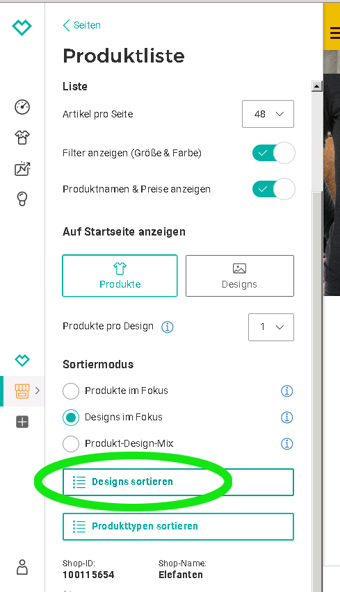 Seiten > Produktliste > Designs sortieren (siehe Shot Grün umkreist).
