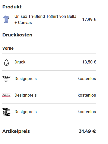 Zumal es da ganz andere Ansätze gäbe, hier ein kleines Beispiel, wenn man im Designer auf einer Druckfläche mehrere Dinge (Designs oder Texte) kombinieren will, zahlt man nicht einmal die Druckgebühr für den Druckbereich, sondern pro Element im Druckbereich. Will man also über und unter einem Design beispielsweise jeweils einen Text haben, so zahlt man 3 mal 4,50 € = 13,50 €. Hat man das selbe als ein Design zahlt man nur 1 mal 4,50 Euro.