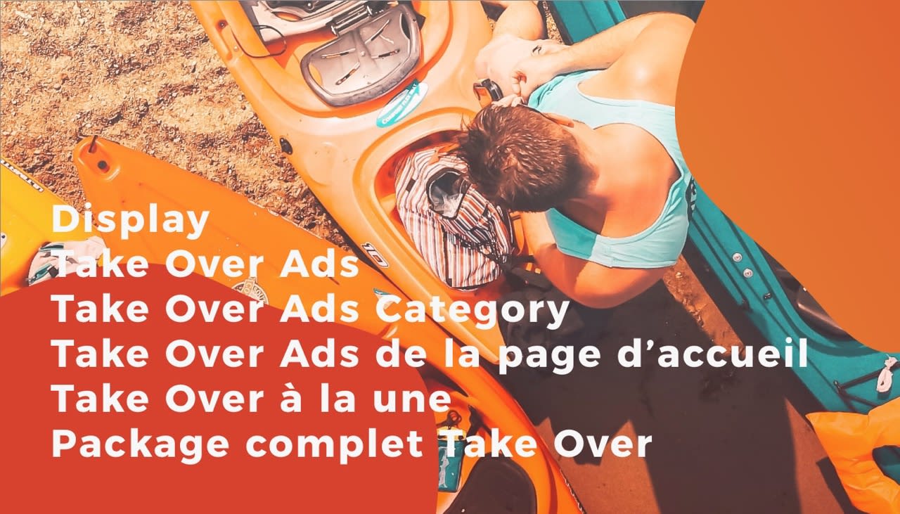 Les Take Over Ads sont un package publicitaire très complet qui se commande auprès du Service publicitaire de Reddit. L’annonce est diffusée pendant 24 heures. Les Take Over Ads catégorisées apparaissent dans les subreddits en question. L’annonce sera visible à l’arrivée d’un·e utilisateur·rice dans le forum. Les formats des Take Over catégorisés sont soit un post promu, une bannière placée dans le header ou une bannière flottante.