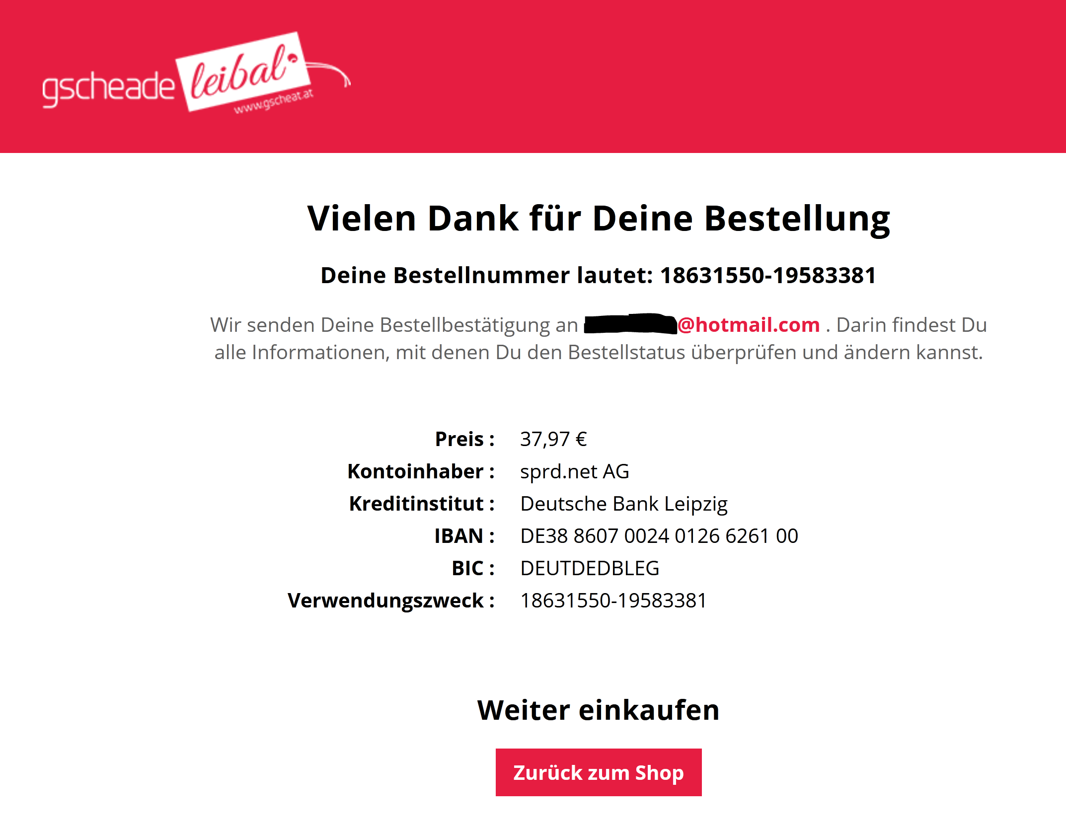 In meinem österreichischen Shop wird den Kunden im Checkout bei der Vorkassa das österreichische Konto angezeigt (richtig), auf der Bestätigungsseite wird dann allerdings das deutsche Konto angezeigt (falsch) und in der Mail wieder das österreichische.