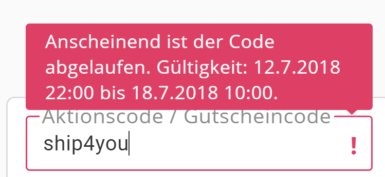 Der Gutscheincode SHIP4YOU ist noch für das Jahr 2018 hinterlegt. Gratis Versandkosten von 13.-17.7. funktioniert nun leider nicht.