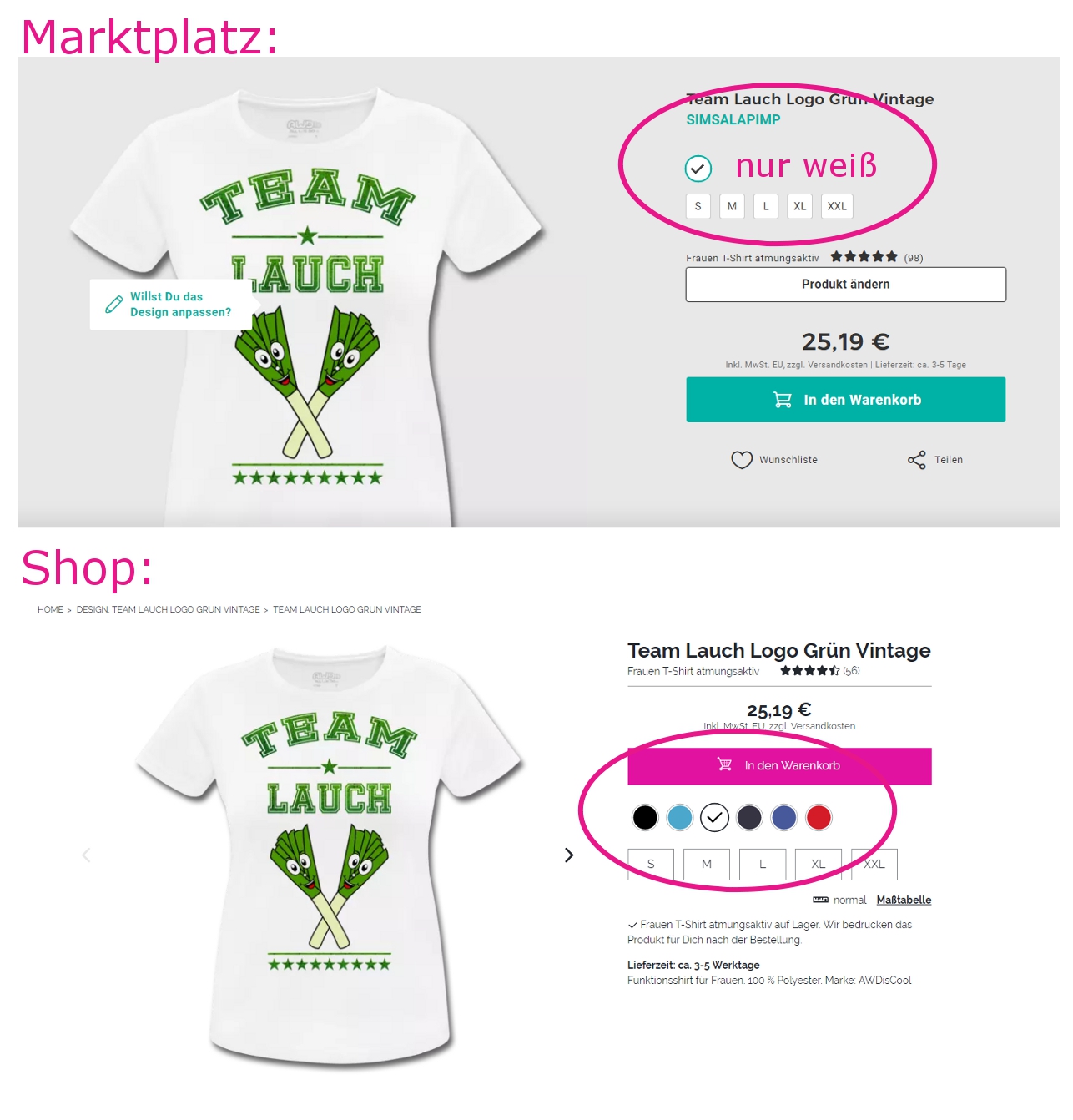 Es geht darum, daß das selbe Motiv, das auf dem Marktplatz nur in der Farbe weiß angeboten wird, im Shop in bunt angeboten wird. Das ist bei allen Motiven und bei allen atmungsaktiven Produkten so.