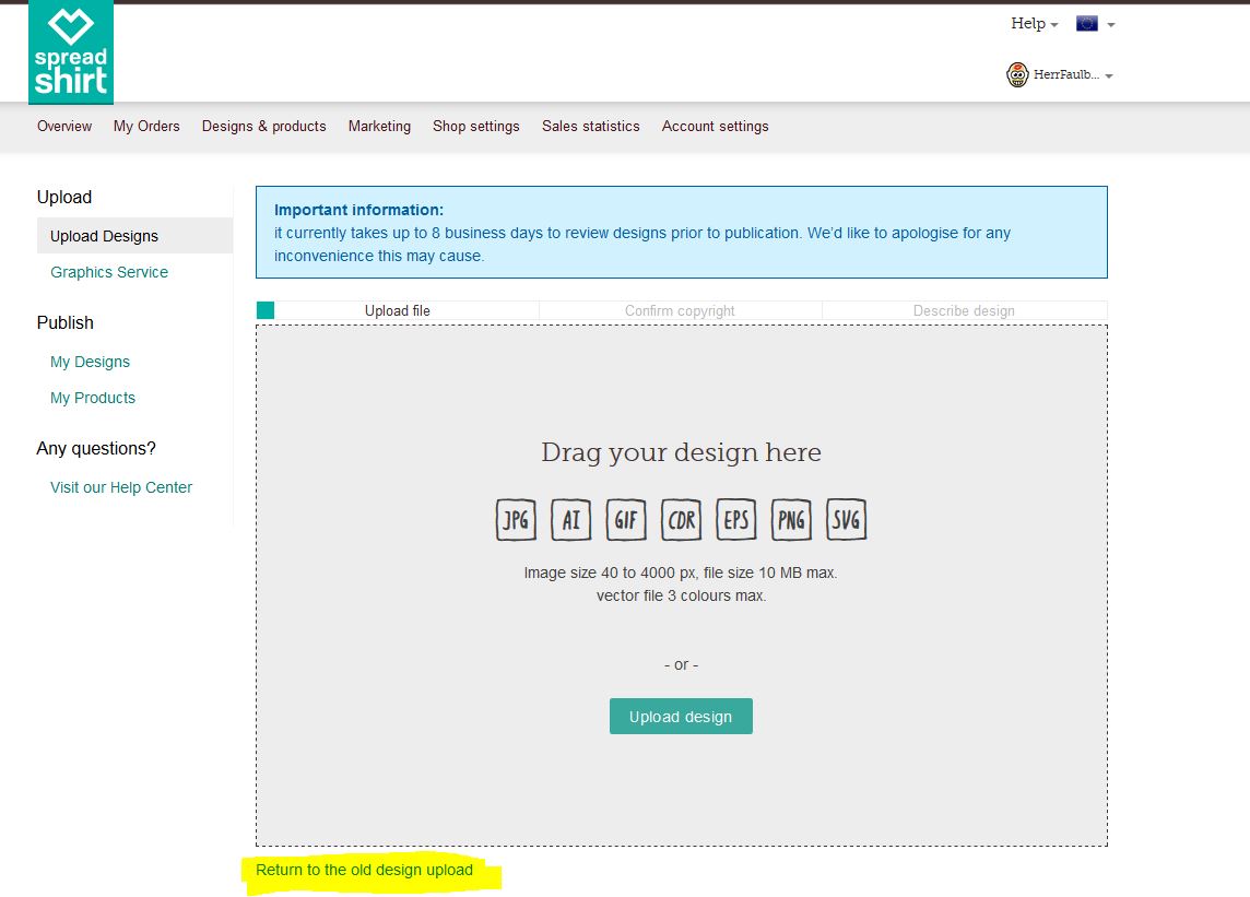 (Den nutze ich übrigens sowieso. Allerdings ist der Klick auf “Return to old design upload” ja auch schon wieder ein Klick mehr.)