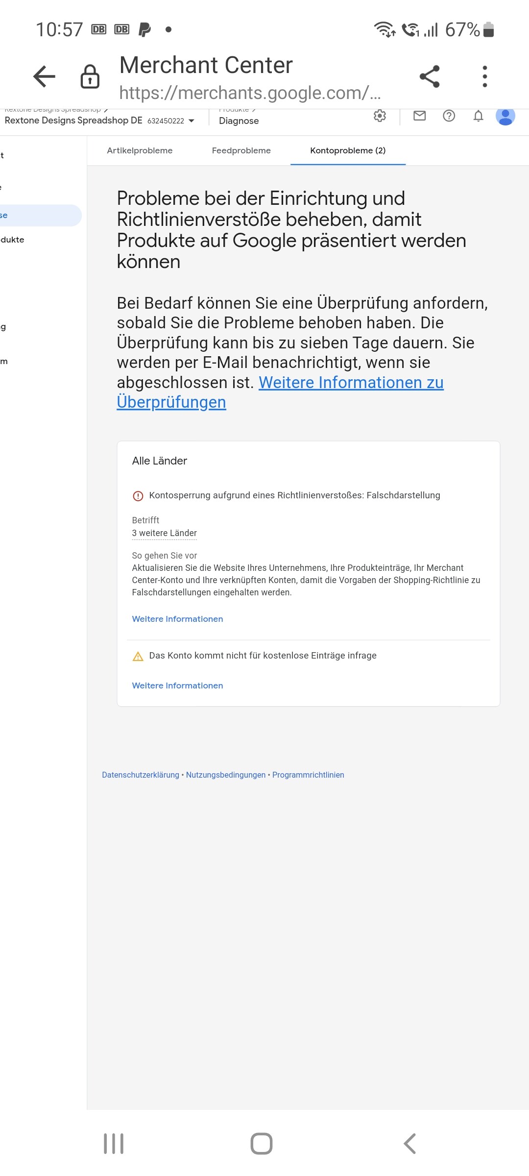 Hatte schon mal jemand das Problem, dass das Google Merchant Center Konto wegen “Richtlinienverstoß: Falschdarstellung” gesperrt wurde? Bei mir trat das ganz plötzlich auf, jetzt wurden alle Produkte abgelehnt. Leider hilft Google einem überhaupt nicht, die Ursache dafür herauszufinden. Weder bei Anfragen an den Support (die können anscheinend keine Details einsehen!), noch über das Diagnose-Fenster, denn als Beispiele neben dem Ablehngrund werden jetzt einfach alle meine Produkte angegeben. So kann ich nicht einen einzelnen “Bösewicht” identifizieren, der das vielleicht verbrochen hat.