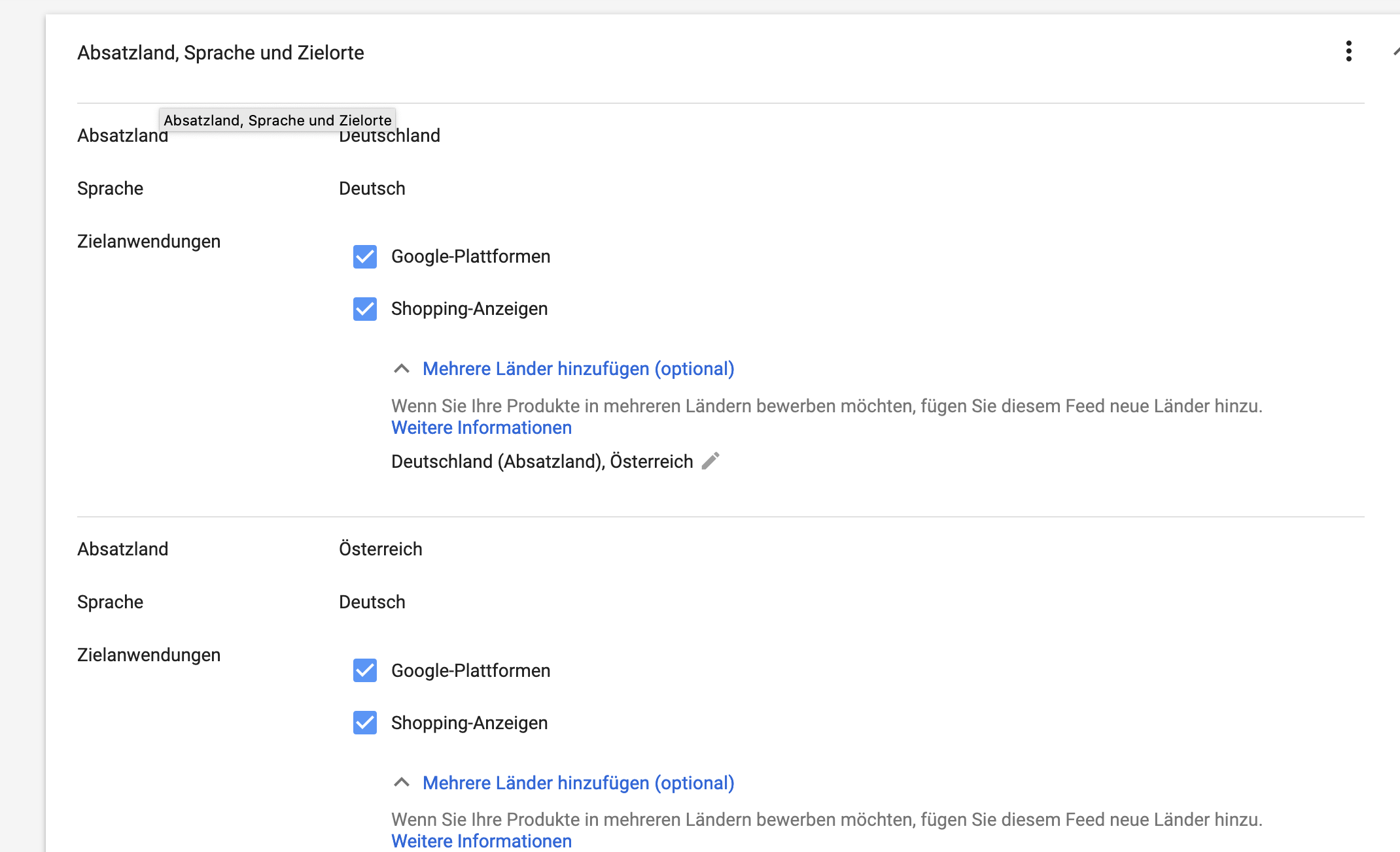 Wenn du AT und DE als Absatzländer angelegt hast, sollte dein Account folgendermaßen aussehen: