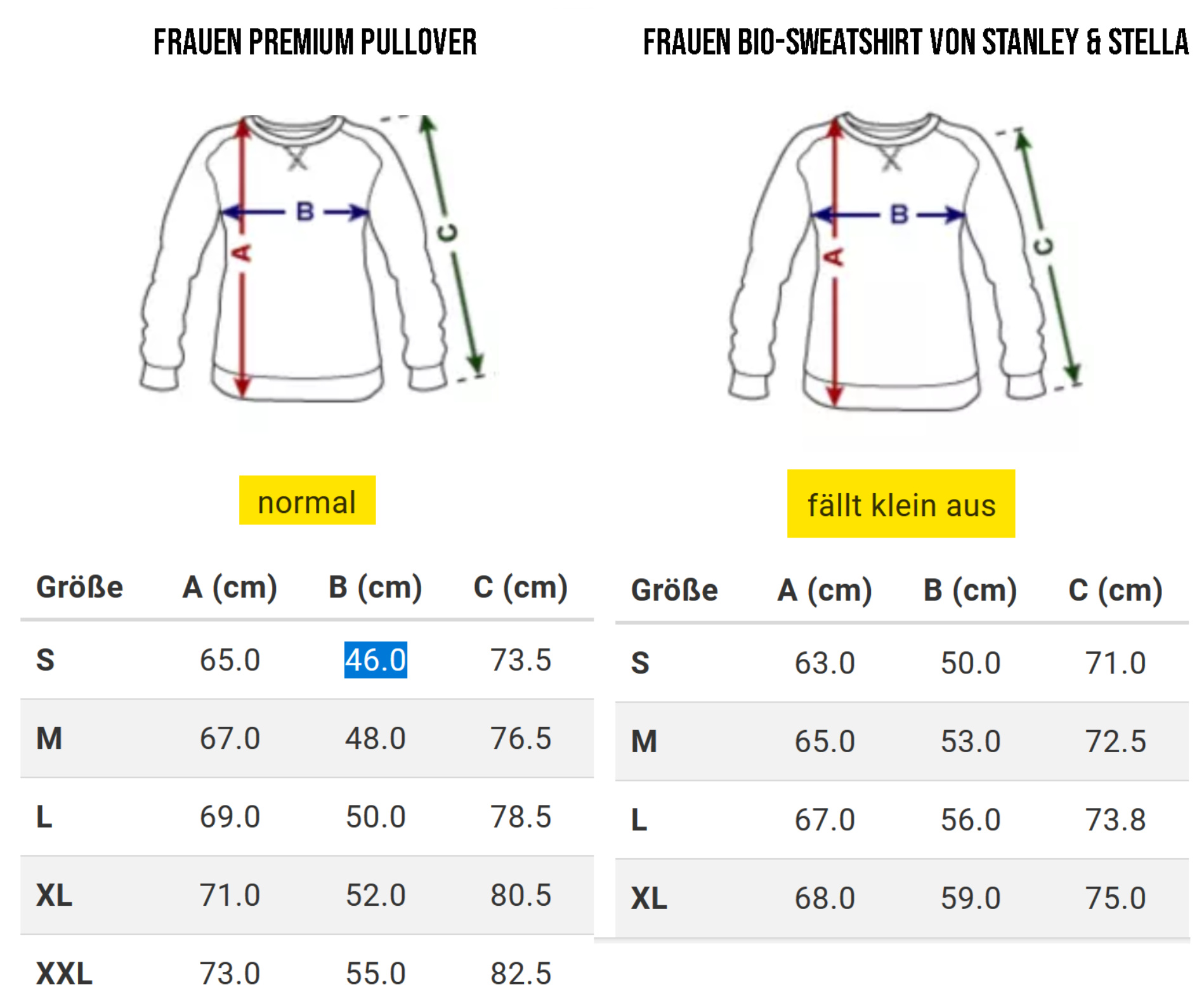 Finde den Fehler… der Frauen Premium Pullover ist mit “normal” angegeben, allerdings in der Größe L um 12 cm kleiner im Umfang als der “fällt klein aus” Bio Sweater
