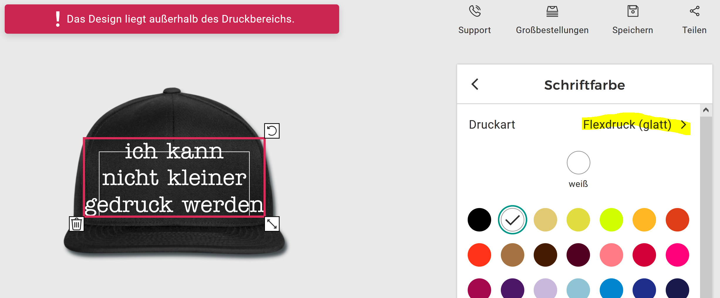 Die minimale Größe vom Flex ist selten für Kappen brauchbar. Umgehen kann man das Problem nur, indem man auf “Farbe” klickt. Dann auf “Flexdruck” und dort die Druckvariante auf “Lasertransfer” ändert. Danach lässt sich die Schrift verkleinern.