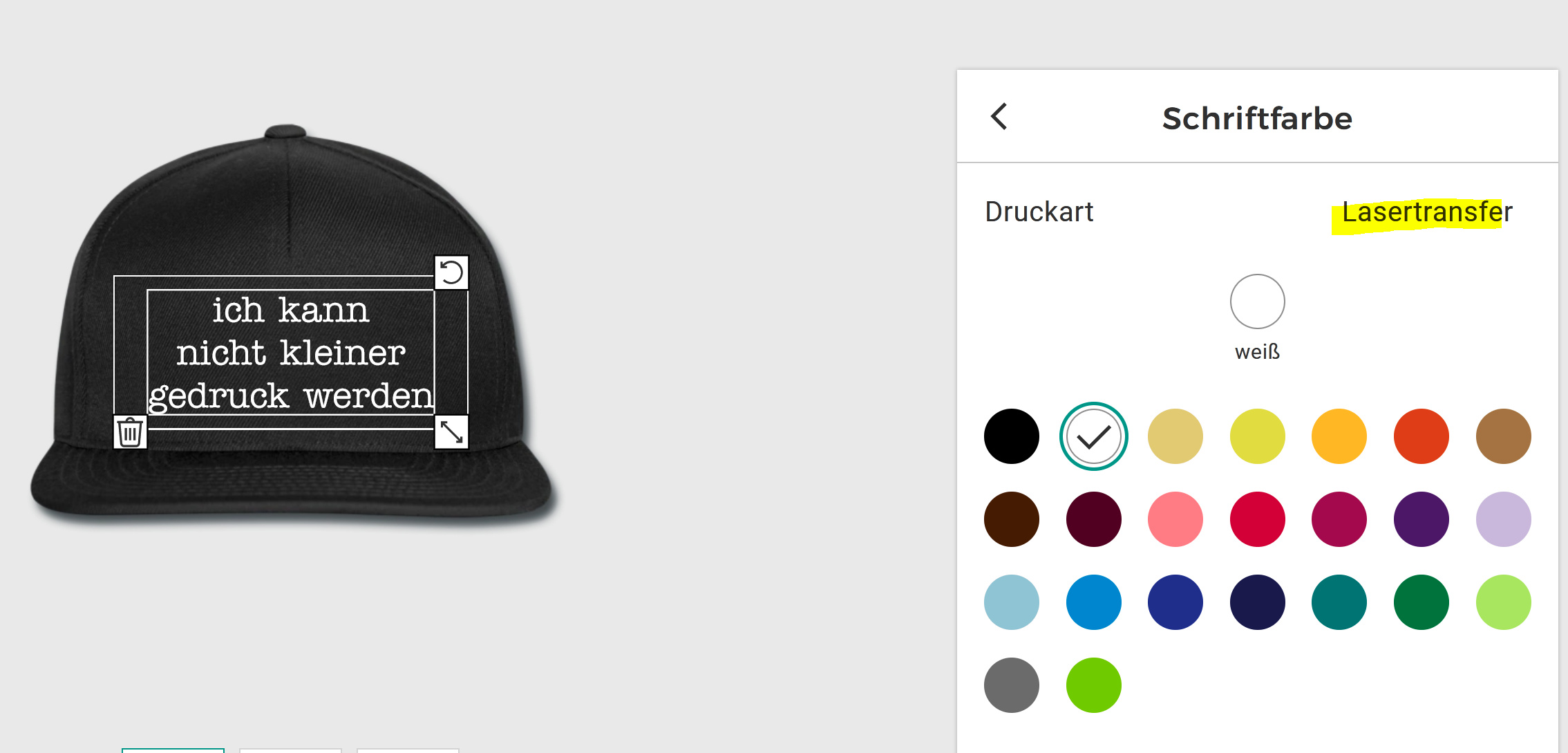 Bei den Kappen gab es vor kurzem eine Umstellung. Früher wurde der Druck automatisch auf Lasertransfer umgestellt, wenn die Schrift oder das Design verkleinert wurde. Nun funktioniert das nicht mehr. Wenn man einen Text auf die Kappe drucken möchte und versucht den Text zu verkleinern bleibt der Flexdruck bestehen und somit auch die minimale Größe vom Flexdruck.
