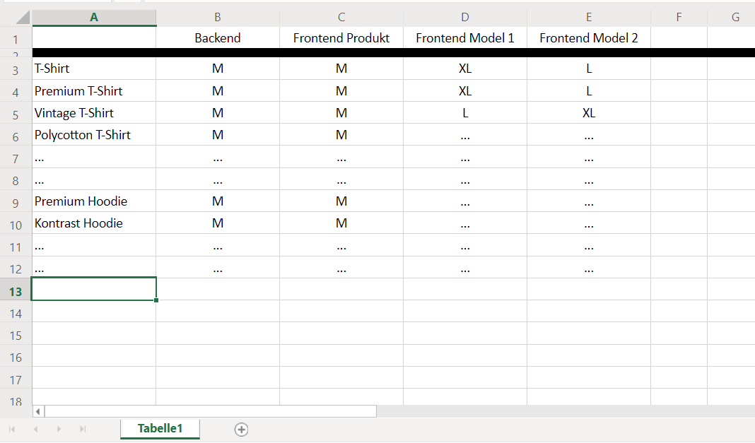 Eine super Sache wäre es, wenn es zu diesem Thema auch eine Liste mit allen Textilprodukten gäbe, die in verschiedenen Größen bestellbar sind. Könnte so aussehen: