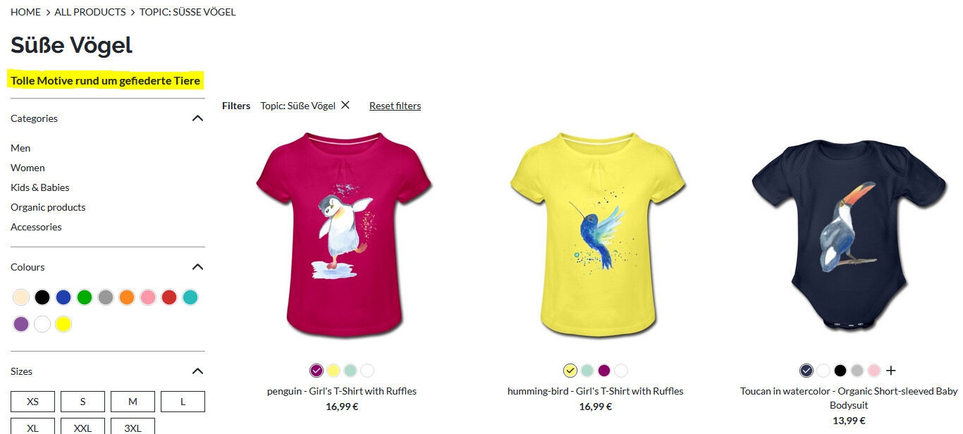 Hallo @Britta_Spreadshop danke für die schnelle Antwort. Der Text wäre nur für SEO. Z.B. ein kurzer Text zu einer Kategoire die “Geschenkideen für Akita Inu Halter” heisst. Der Text könnte auch unterhalb von den Produkten/Designs stehen. Wäre sogar besser.