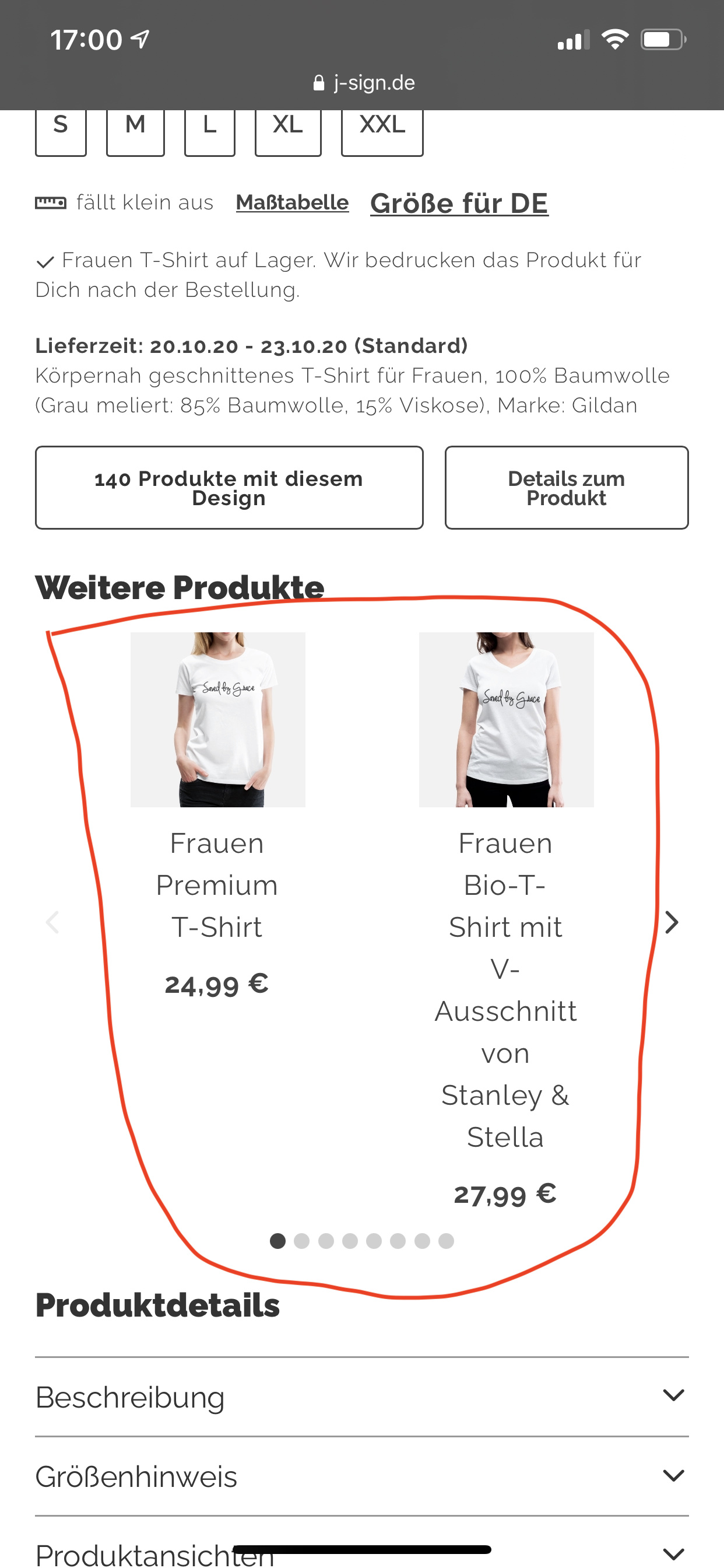 Hallo @Lena_Spreadshop, nachdem ich nun etwas zeit habe meinen shop etwas auf Vordermann zu bringen, bin ich bei der Mobil Optimierung hängengeblieben. Und zwar werde da bei weitere Produkte 2 vorgeschlagene Produkte nebeneinander platziert. Wie im beigefügten Screen shot zu sehen, schaut das bei unterschiedlichen Bezeichnungen etwas grauenhaft aus. Könntet ihr das auf dem Smartphone bitte auf einspaltig stellen. Das währe mega. gruß