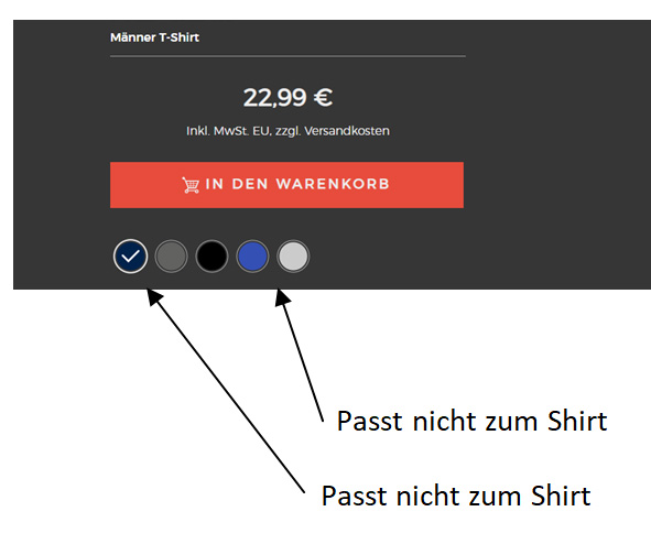 Der button wird erstmal nicht angepasst. Ist etwas kompliziert zu erklären… aber wenn wir hier beim Button eine andere Farbe anzeigen würden, dann würden zu viele Produkte, die nur in dieser Farbe erstellt wurden deaktiviert werden und das wollen wir nicht. Ich weiß es ist nicht ideal hier nicht die genaue blaue Farbe anzuzeigen, aber zur Zeit lässt sich das nicht anders lösen.