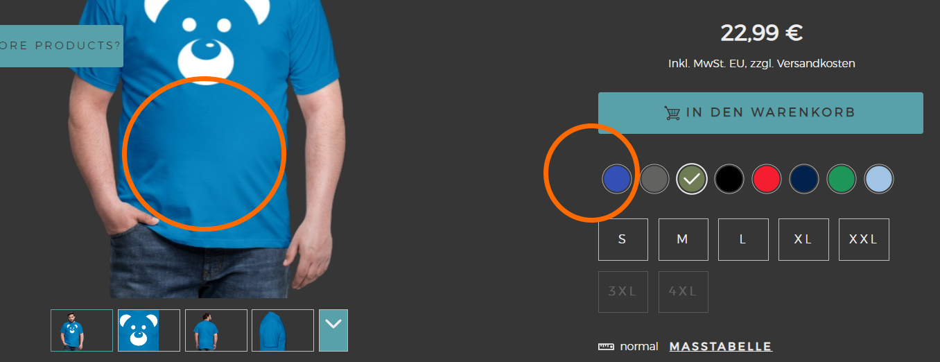 auf dem Screenshot sieht man das die Vorschaufarbe (der kleine Button) ganz ein anderes blau ist als wie das T-Shirt - Standard Männer Shirt… weiss leider nicht wie ich da die ID rausbekommen von dem Shirt. In der Partner Area steht leider auch nur Männer T-Shirt