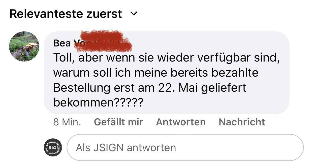 Von unseren Masken wurde noch keine (!) verschickt und jetzt soll zeitnah wieder die Verfügbarkeit der Masken angestellt werden. Wie @Berliner_Original auch schreibt, ist dann Euer Speicher wieder in null-komma-nichts am Überlaufen? Was soll ich den Leuten sagen, die noch nicht Ihre Maske haben wir aber schon wieder neue Masken verkaufen - das führt doch nur zu einem Shitstorm.
