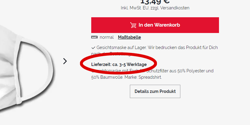 ich habe jetzt gerade gemerkt dass beim Produkt noch 3-5 Werktage Lieferzeit steht und im Checkout Juni. Das führt nicht nur zu vielen verärgerten Kunden, um die auch wir uns kümmern müssen, das kann auch die Abmahner auf den Plan rufen - Bitte asap ändern. Ich persönlich hätte es klüger gefunden das Produkt auf “vorübergehend nicht lieferbar” zu stellen, als eine Maske in 8 Wochen zu liefern.