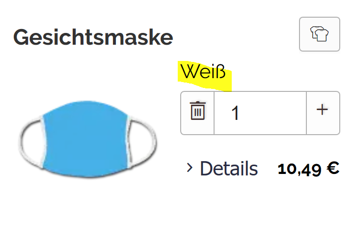 noch etwas, dass viele Kunden verwirrt und vom Kauf abhält - wir bekommen diesbezüglich sehr viele Anfragen. Wenn man eine farbige Maske kauft, wird im CYO und leider auch im Checkout die Farbe “weiß” angezeigt. Mir ist bewusst, weshalb das so ist. Die Kunden verstehen das leider überhaupt nicht.