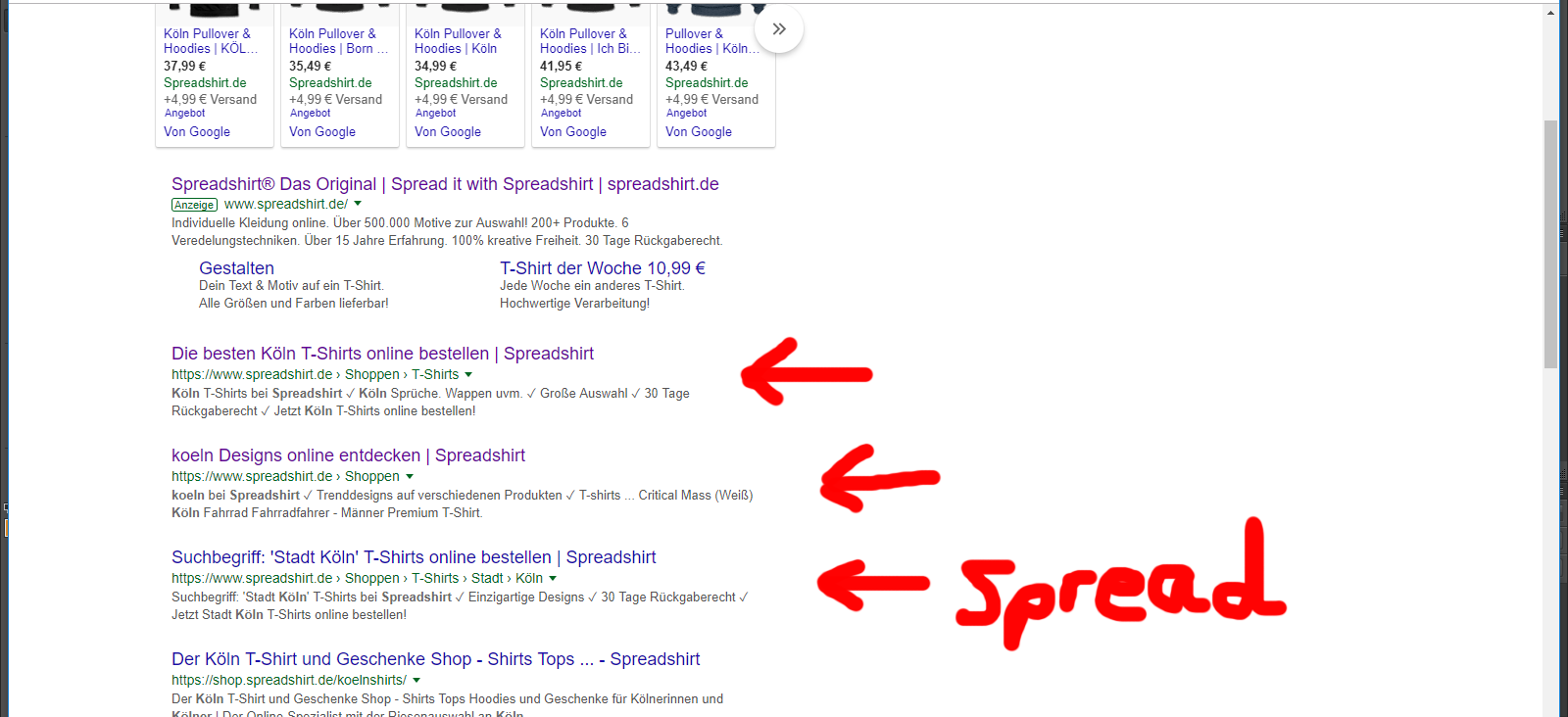 Also bei mir steht er auf Platz 1 der organischen Suchergebnisse.mit dem Spreadshop und auf Platz 2 mit dem Showroom. Erst danach kommt Spreadshirt selber mit allen anderen Köln-Shirts.