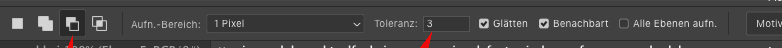 Ja für schwarz mußt man ultra sauber arbeiten, aber schwarz ist auch kein angenehmer Hintergrund. Um diese Ränder zu vermeiden mußt da allgemein beim Zauberstab eine höhere Toleranz einstellen (Pfeil rechts), in deinem Fall ca 3. Dann gibt es keinerlei Fransen. Und sollten dennoch Unebenheiten in der Auswahl drin sein, dann schneidest du diese mit dem Polygonlasso im Subtrahieren-Modus aus (Pfeil links).