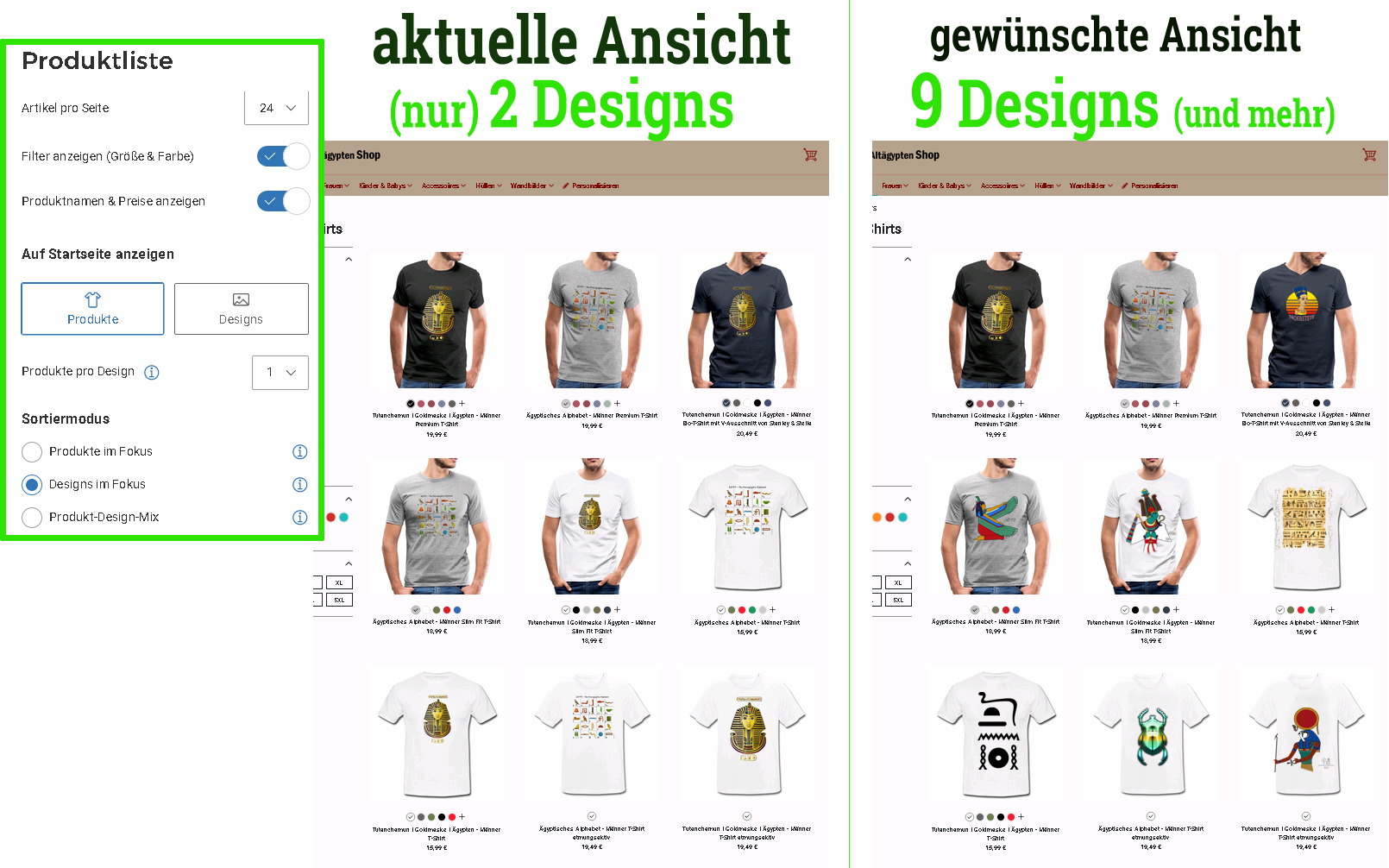 ich möchte gerne, dass in meinen Unterrubriken bei den Tshirts, das erste (1.) gezeigte Tshirt (meist das Premium-Tshirt) nicht nur 2-3x angezeigt wird, sondern alle, die ein verschiedenes Design haben (habe ca 150).