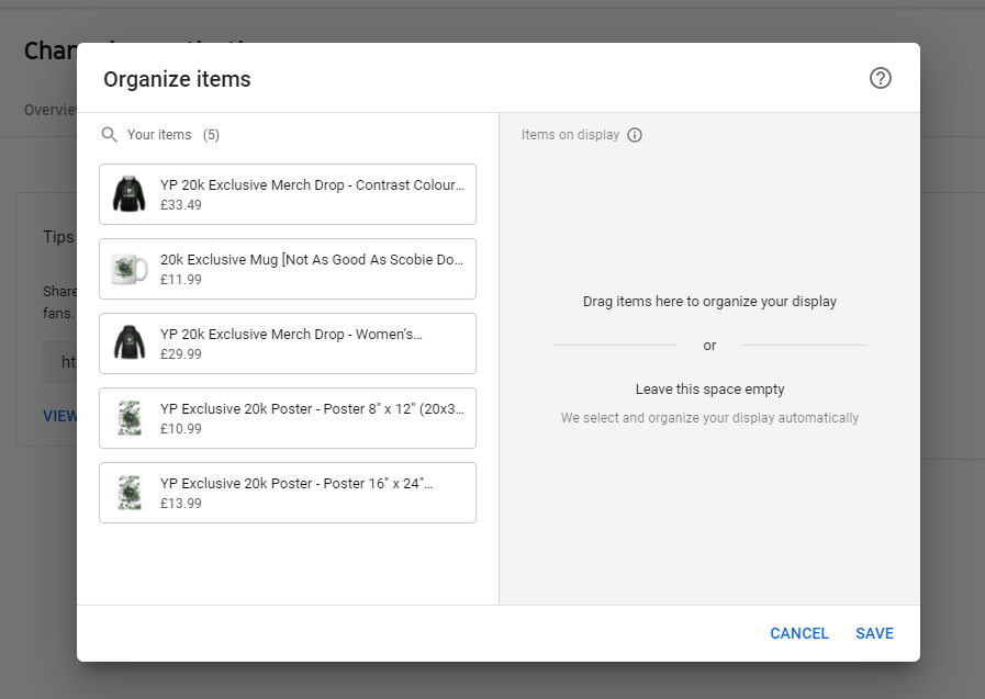 I’ve connected my account and now some of my merch is showing on my youtube merch page but some of it isn’t. I checked My spreadshop Youtube Merchandise tab and it has all 8 products listed but on the youtube merch tab, only 5 items show. Is this something I’ve done wrong or just a bug as I know this feature is fairly new? (I’ve added images to this thread as I can only upload one on this post)
