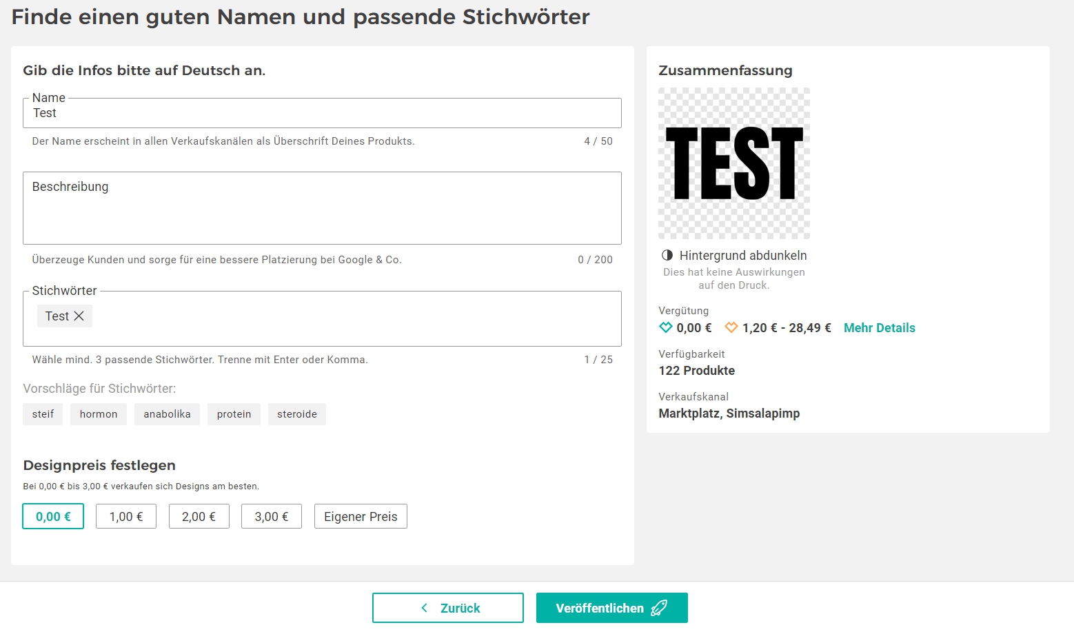 Den Namen, die Produktbeschreibung, die Stichworte und den Preis legst Du am Ende der Produktgestaltung fest. Sieht dann so aus: