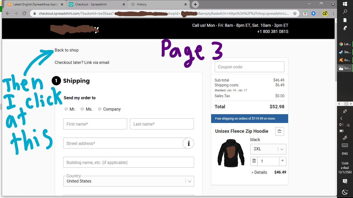On the checkout page, if the customer hits “Back to Shop” he/she’s taken to shop.spreadshirt.com/myShop rather than myDomain.com (Picture Page 4). That creates confusion as the customer won’t find his cart which he is sent to the wrong page.