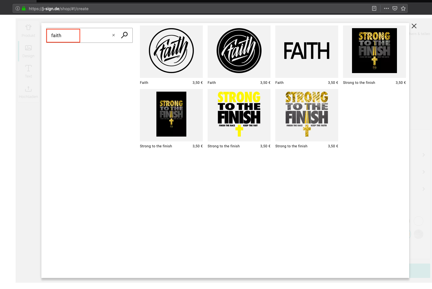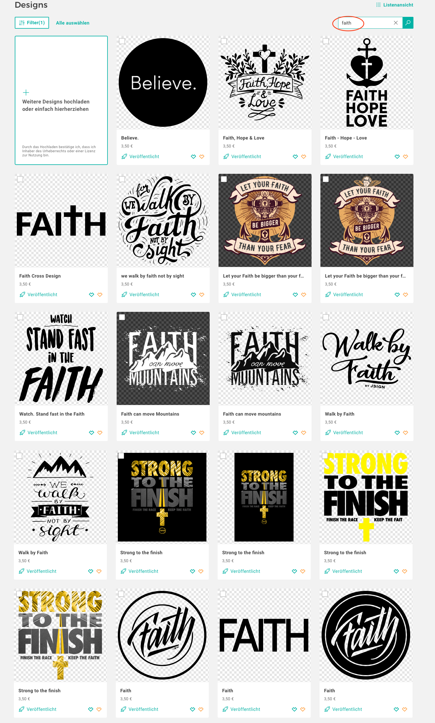 usw… Hier mal der screen shot vom designer und vom partner Bereich jeweils mit dem Suchbegriff faith.