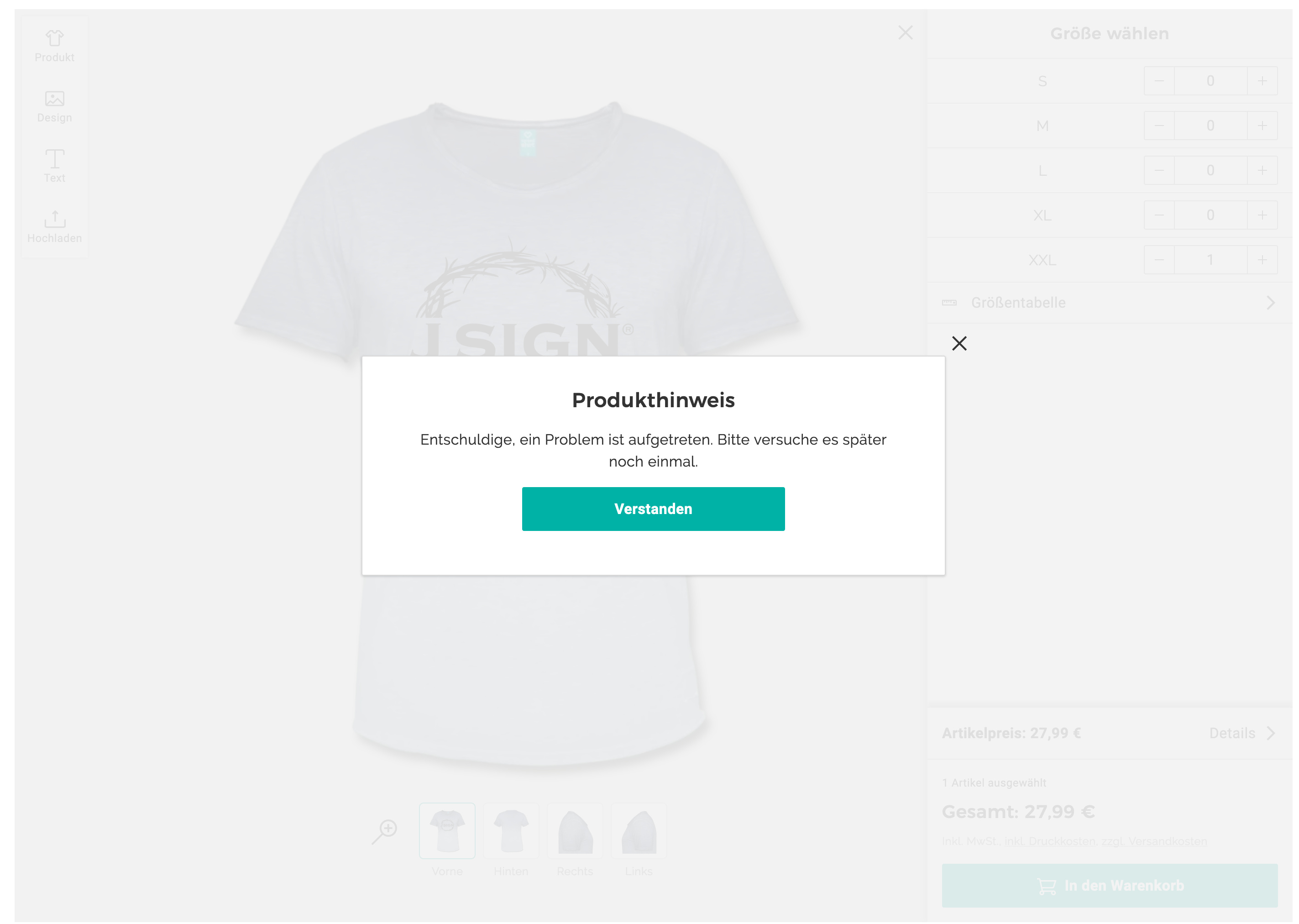ich wollte gerade wieder mal ein Shirt Designen und ich bekomme wieder die Fehlermeldung wie vor paar Monaten. Danach hab ich es nicht mehr versucht. Dachte das Problem wurde behoben. Fehlermeldung lautet “Entschuldige, ein Problem ist aufgetreten. Bitte versuche es später noch einmal”.