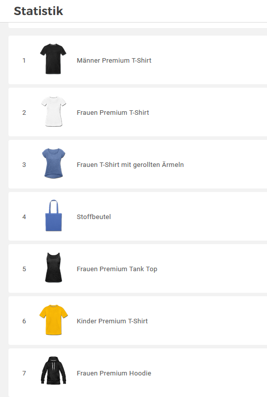 in meiner Produkte-Statistik taucht als Nr. 1 das Männer-Premium-Tshirt auf. Aus einem Zeitraum von knapp 2 Jahren. Folgend das Frauen-Premium-Tshirt. Auf Rang 4 der Stoffbeutel, was mich echt wundert. Die Farbanzeige ist aber nicht verbindlich, es sind verschiedene Tshirt-Farben bei Verkäufen gewesen.