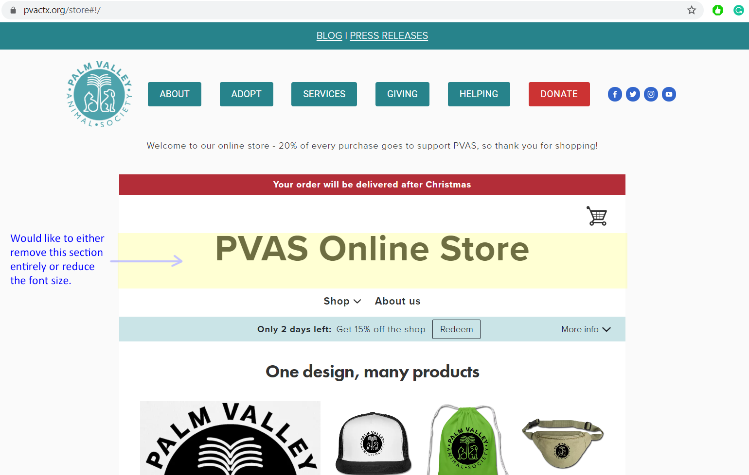 Hello! Hoping to find some custom CSS to reduce in size or entirely remove the shop name in my embedded shop. Image attached.