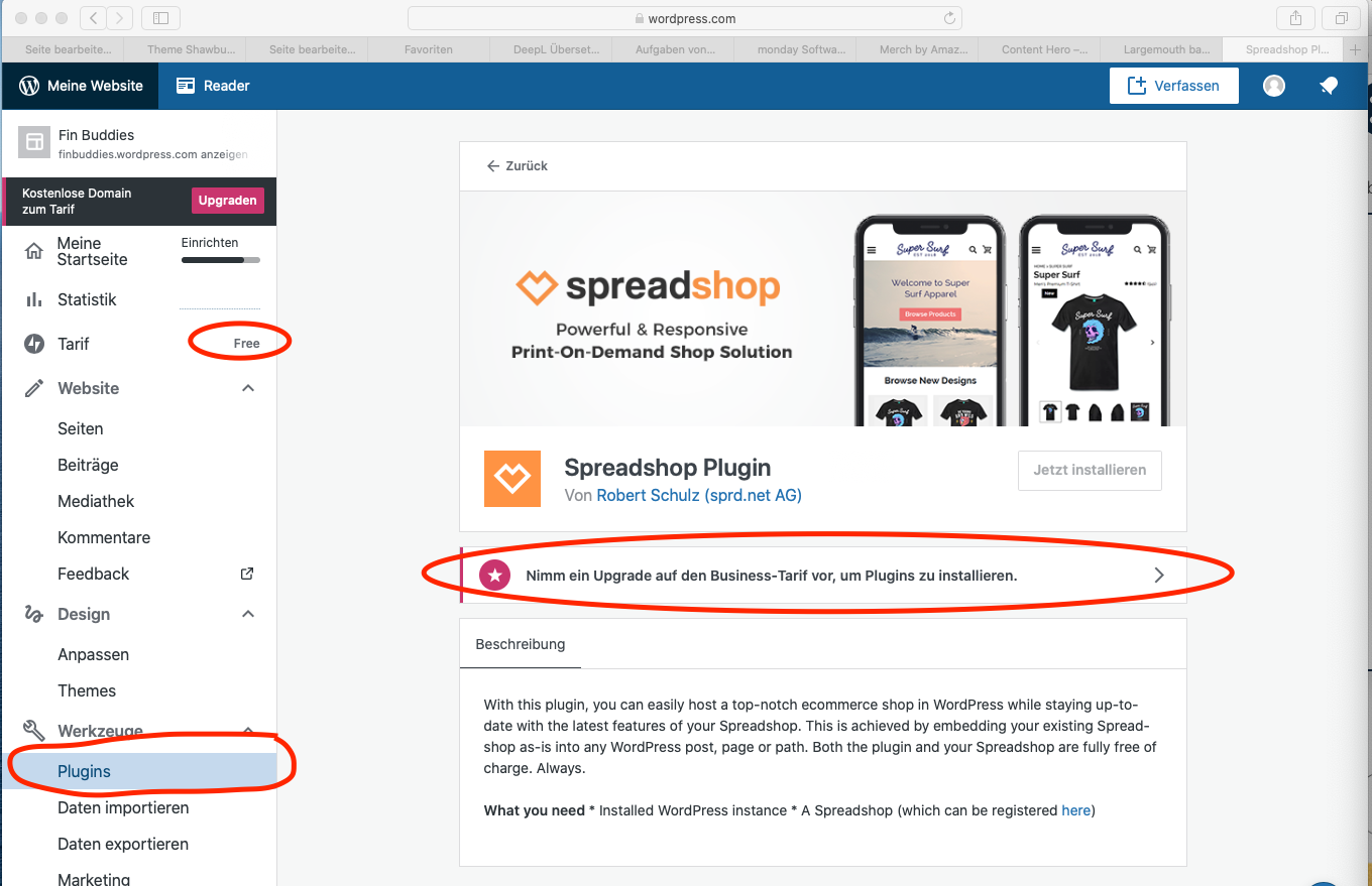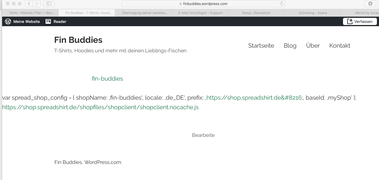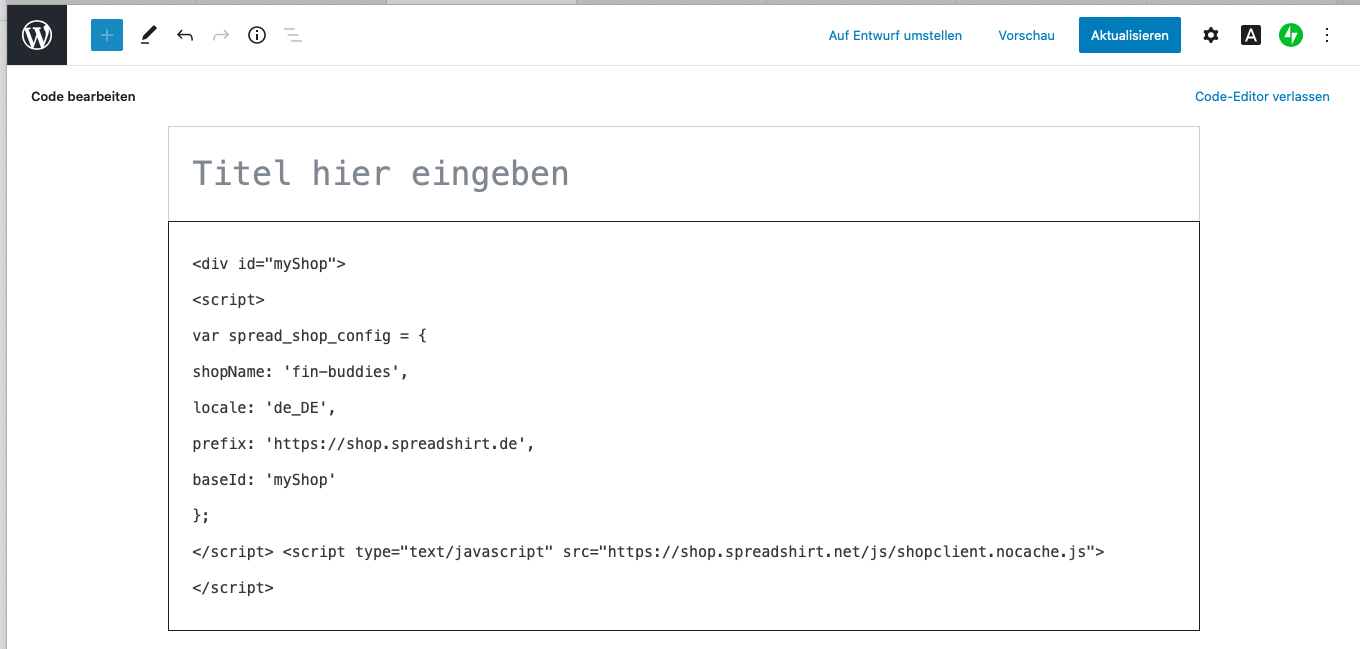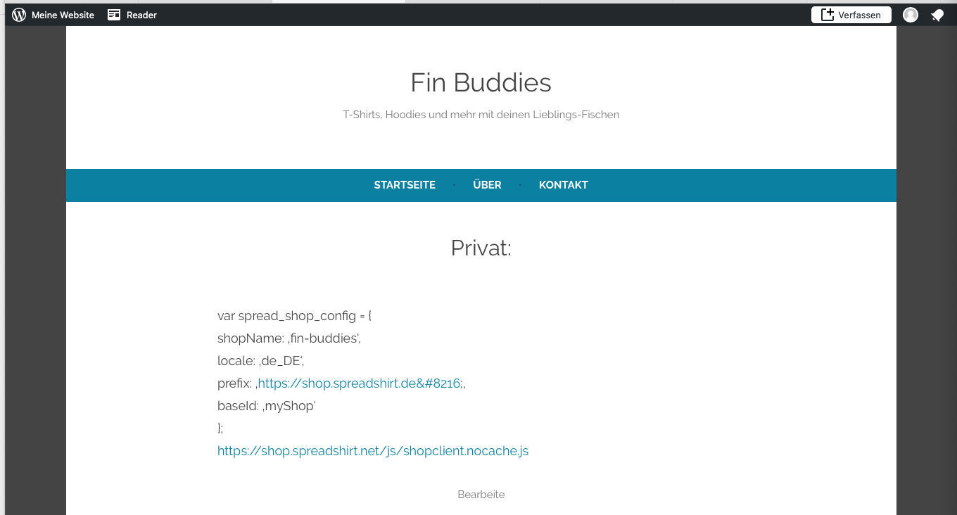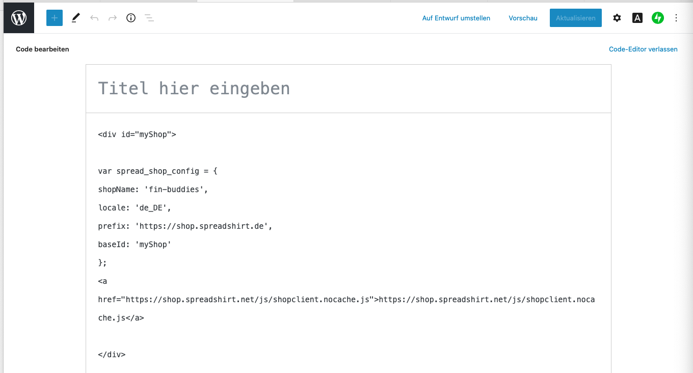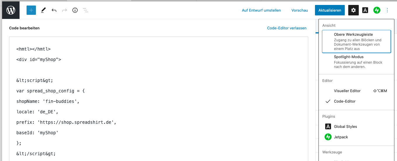 ich versuche meinen Spreadshop mittels des im Backend bereit gestellten HTML-Codes in meine im Aufbau befindliche Wordpress-Seite einzubauen.