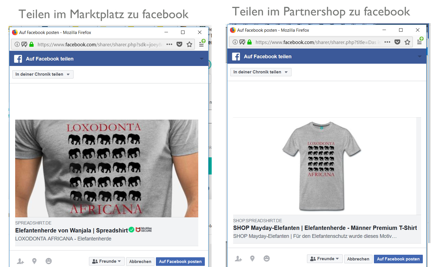 WARUM unterscheiden sich die Bilder für Facebook-Verlinkungen zwischen Marktplatz und Spreadshop? Wenn man aus seinem Marktplatz-Showroom(Shop) was teilen will, dann ist das Motiv größer und das Produkt angeschnitten. Hingegen beim Partnershop ist das Motiv klein und das Produkt in ganzer Größe abgebildet.