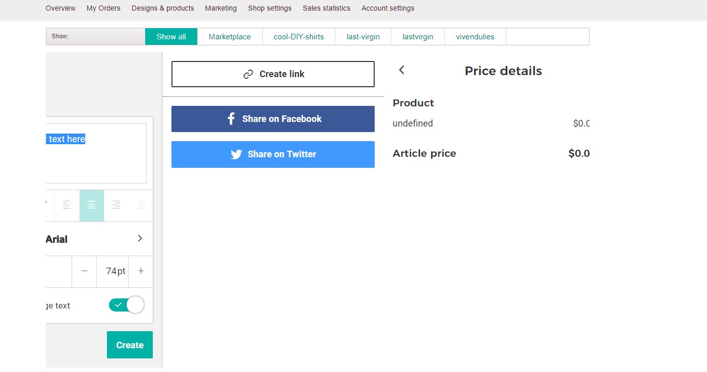 Wähle ich Text einfügen, klicke ich wieder mehrfach bevor, das Tool sich bequemt, den Screen zu wechseln. Dann fügt es mir den Platzhalter ein und wenn ich den Platzhalter anklicke um den Text unt der das Motiv zu platzieren , verspult es den Screen und mir werden Promolinks zu Facebook und Co angeboten und der Create link. Zu dumm nur, dass das Design noch total verspult ist mit einem Textbaustein an der falschen Stelle. Da ich nicht zurück in die Ansicht komme, heisst das gehe zurück auf Los und kassiere nichts für deine Mühe.