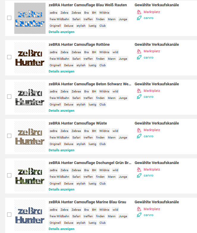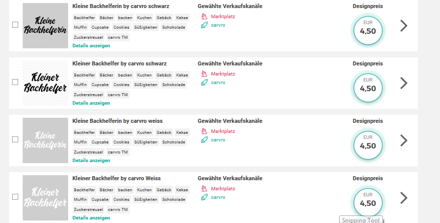 Ich habe gerade einmal gezählt … 98 Designs sind vom Marktplatz geflogen, immer wegen Designserie, und zusätlich 11 vom Marktplatz und Shop!!! Die 11 weil man nicht weiß, ob die Lizenz vorliegt. Diese 11 Bilder habe ich vorher bei SPRD gesucht und nicht gefunden. Es gibt sie nicht. Endlich mal eine Chance was zu verkaufen. Und ja ich habe die Lizenzen. Ich bin doch nicht bescheuert und lade was hoch, was nicht von mir verwendet werden darf. Ich bin Shopbetreiber und stehe mit Klarnamen bei Euch im Netz. Und carvro ist ein geschütztes TM, sonst würde ich dafür wohl kein Logo bauen.