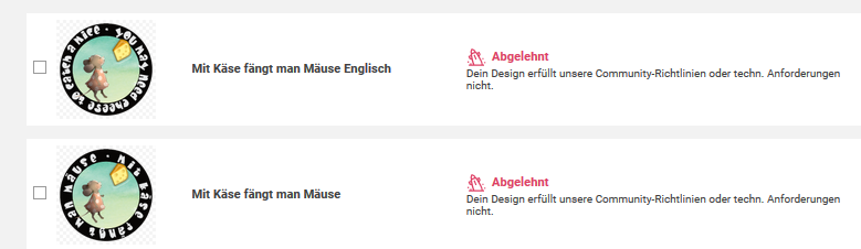 Bei Verdacht auf Copyright muss wenigsten eine automatisierte Mail versand werden, um den Shopbetreiber darüber zu informieren, dass auch dort die Designs verschwinden. Ich kann mir nicht vorstellen, dass so ein Knopf mit einem Mailmakro zu programmieren so schwer ist.