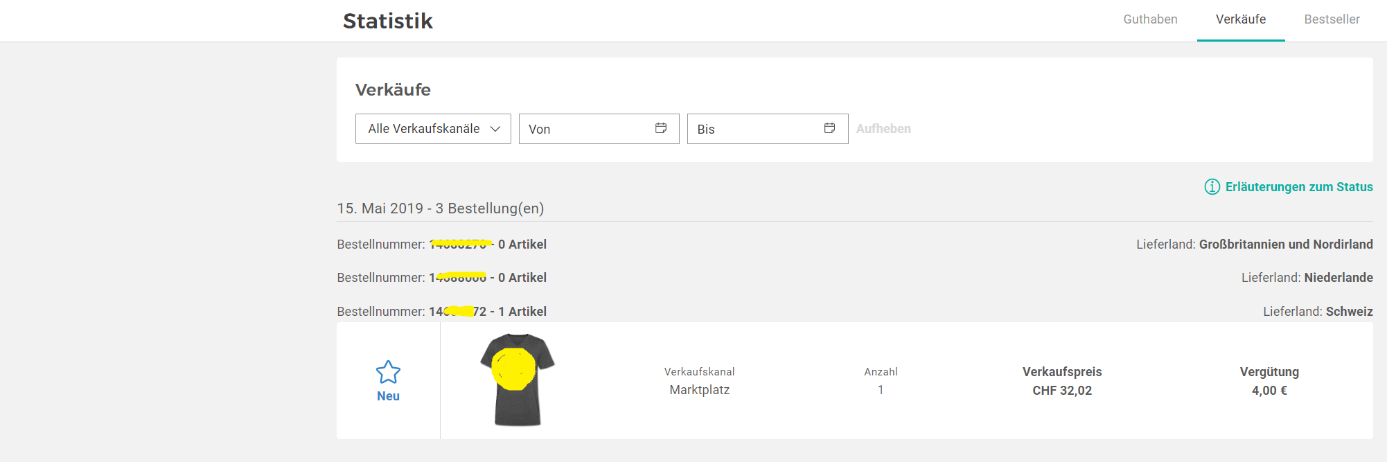 Im neuen Nutzerbereich habe ich eine Verkaufsmail über verkaufte Designs erhalten. Nach Abgleich der Bestellnummer habe ich festgestellt, dass auch dieser nicht im Statistikbereich auftaucht.