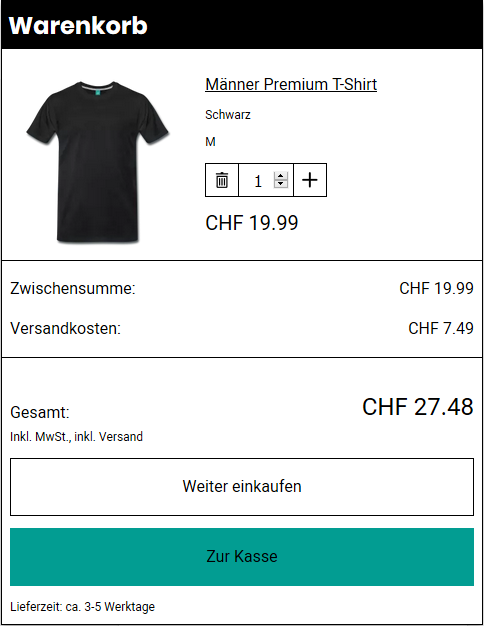 Wenn ja, wie ist es mit der Schweiz? Unter https://help.spreadshirt.com/hc/de/articles/207165489 steht das die Mehwertsteuer bereits enthalten ist. Nun ist es aber so das beinem deutschen Shop in Euro ja der Produktpreis und auch die Versandkosten geringer sind als in einem Shop in schweizer Franken.