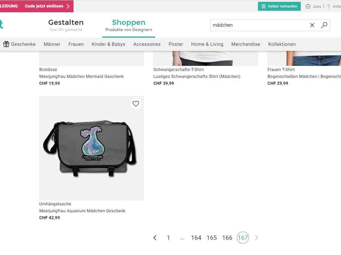 Plus Seite 167 ist das Maximum was Spreadshirt an Seiten anzeigt, dass heisst es gibt noch viel mehr Motive mit dem Keyword “Mädchen”. Ist halt eine riesen “Nische”.