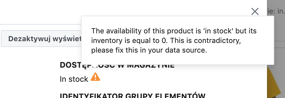 “The availability of this product is ‘in stock’ but its inventory is equal to 0. This is contradictory, please fix this in your data source.”